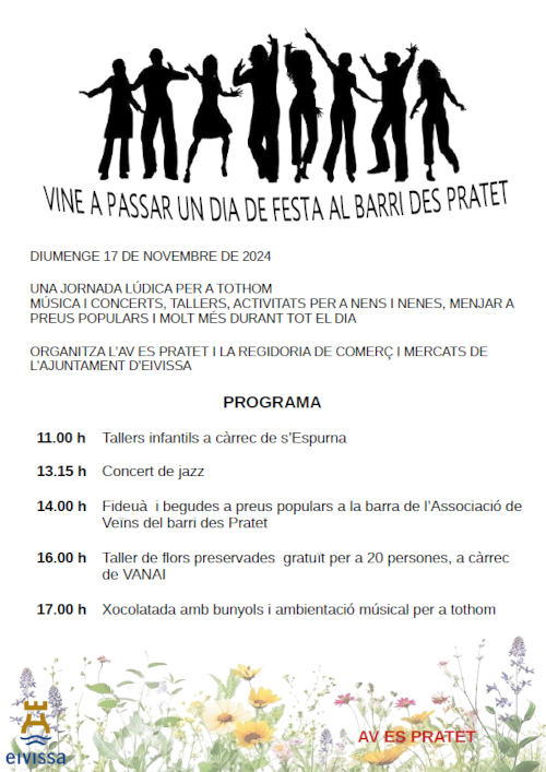 Amb l’objectiu de dinamitzar el barri de Es Pratet, la regidoria de Comerç i Mercats de l’Ajuntament d’Eivissa, junt amb l’Associació de vesins i comerciants d’aquesta zona han organitzat aquest diumenge una jornada festiva per celebrar la remodelació del carrer de Pere Francès. Aquesta iniciativa estava prevista el passat dia 1 de novembre, però a causa del decret de dol oficial per la catàstrofe de la DANA dels dies 31 de novembre, 1 i 2 d’octubre, les activitats es van ajornar al 17 de novembre.
