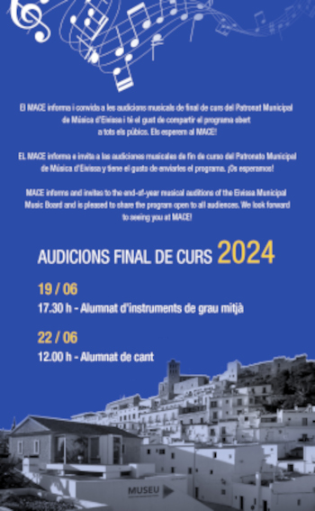 El MACE tiene el gusto de recibir las audiciones de final de curso del Patronato de Música de Eivissa los días 19 y 22 de junio en el Salón de Actos.